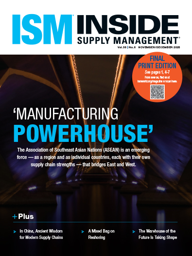 Inside Supply Management® is a leading publication for those within the procurement/sourcing and supply chain profession. Our magazine covers essential news, innovative trends, ISM® PMI® Reports coverage, research analysis, leadership profiles, career strategies and much more.
